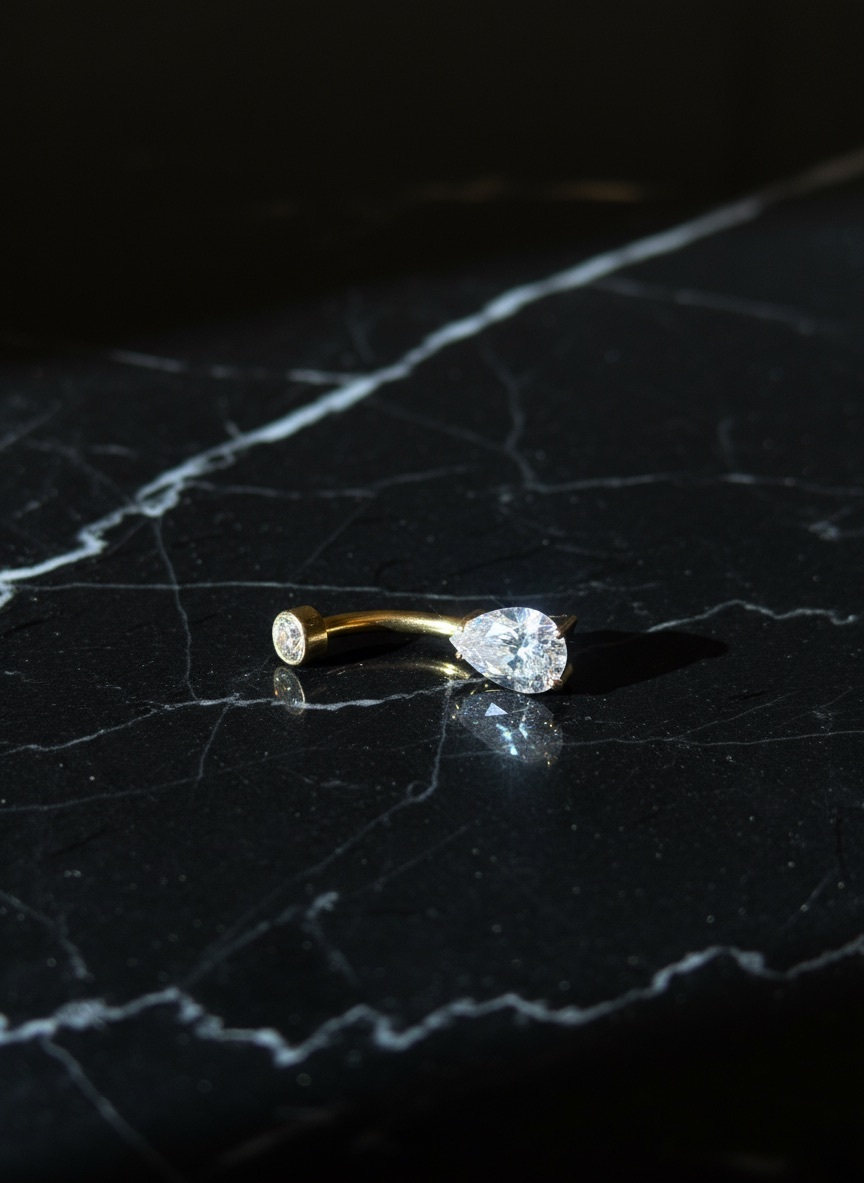 Банан в пупок из имплантационного титана с прозрачными фианитами и PVD покрытием золотистого цвета (под желтое золото)