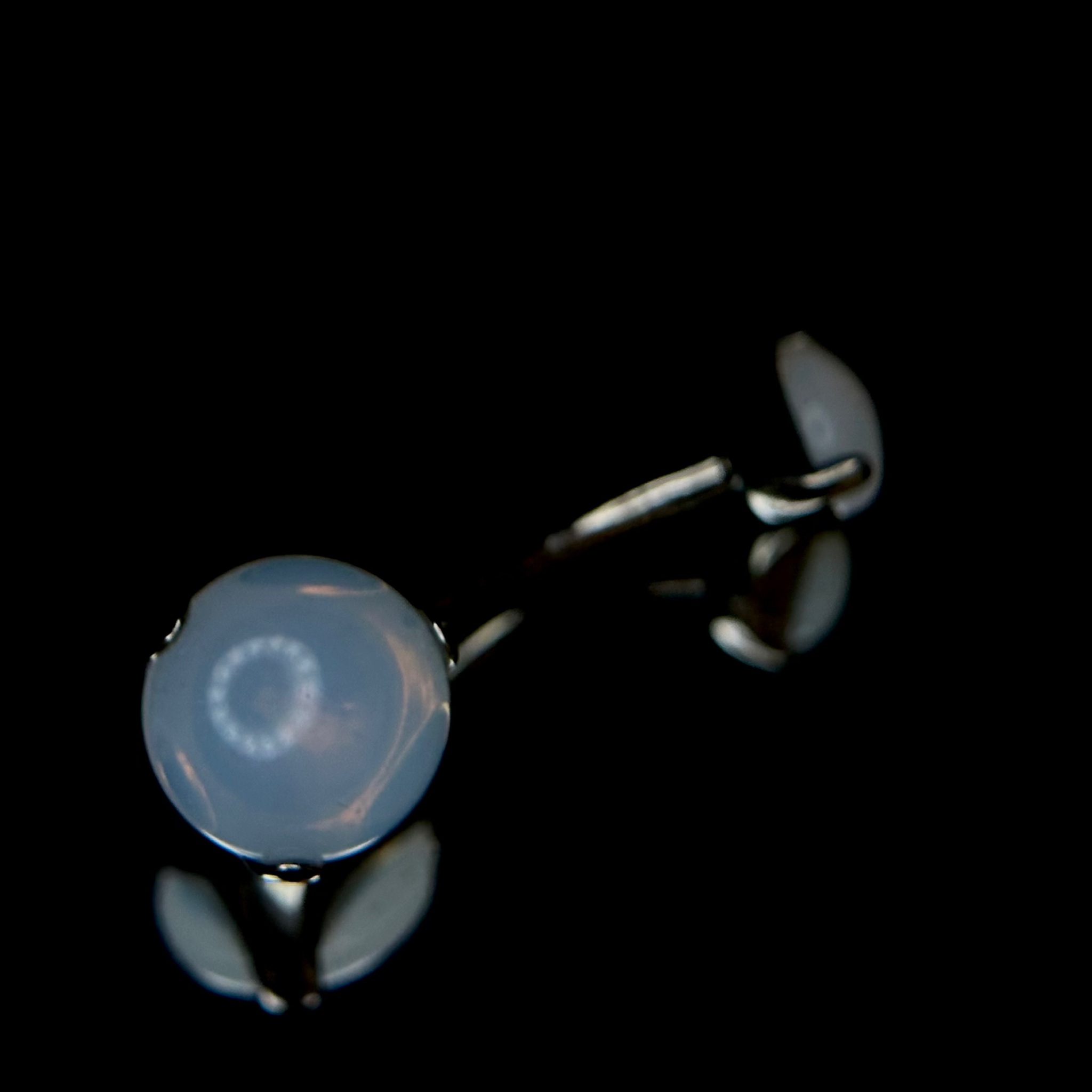 Банан в пупок из имплантационного титана с искусственно выращенными белыми опалами с крупными салатово-оранжевыми прожилками