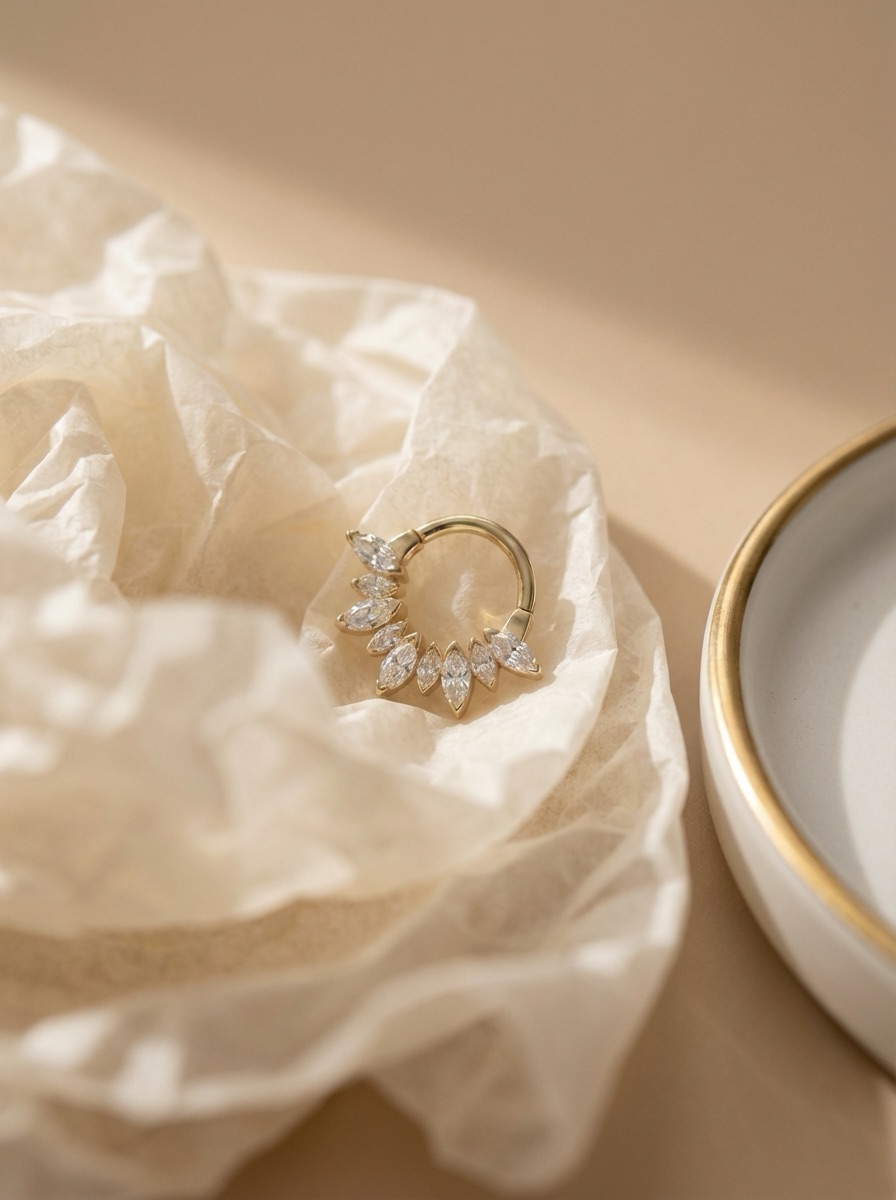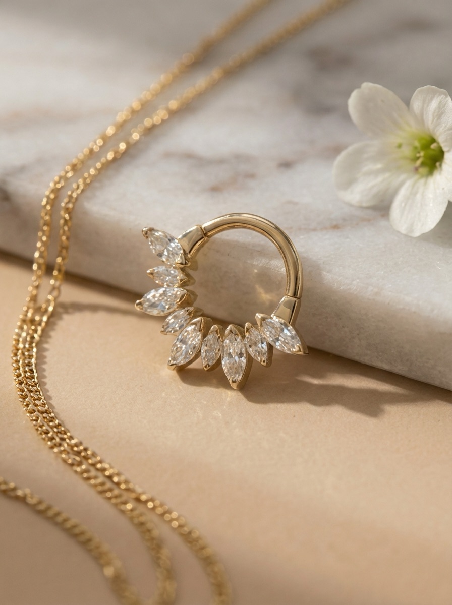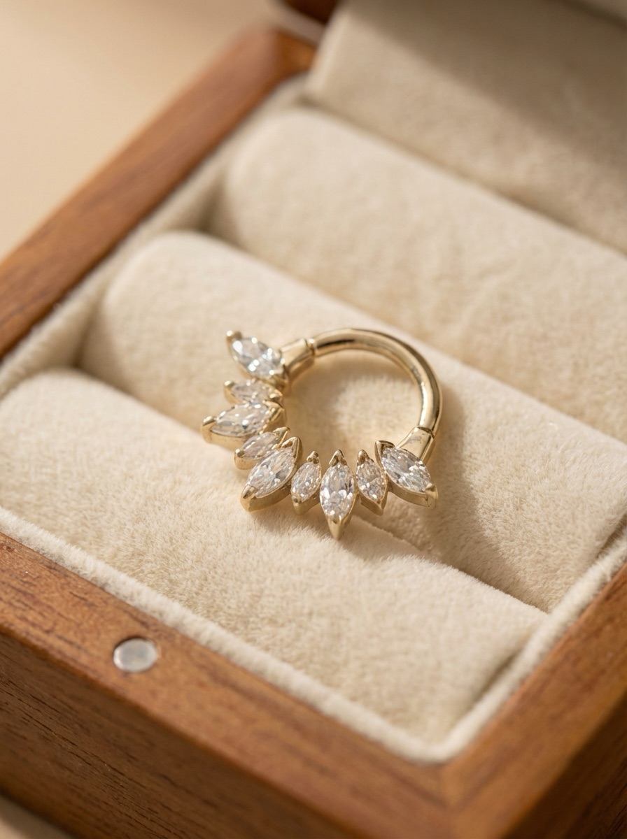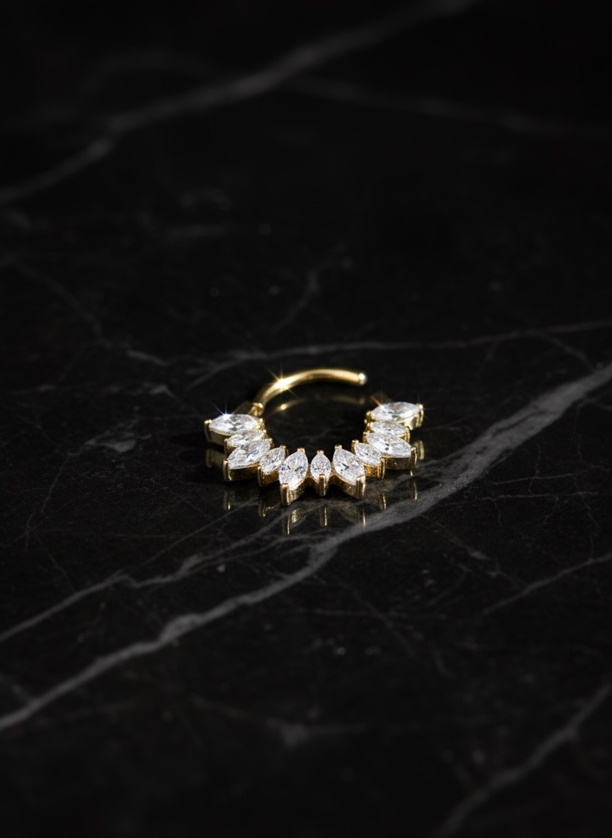 Кликер из имплантационного титана с прозрачными фианитами и PVD покрытием золотистого цвета (под желтое золото)
